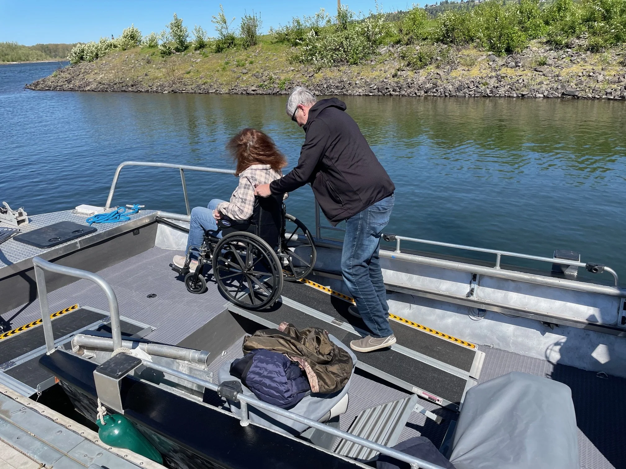 Custom 24 aluminum boat build buy Tuff boat and the name says it all. The boat was originally built as a work boat for construction projects. It has been modified to include a side door that is about the same height as most docks and wide enough for wheelchair ramps to pass through. A front deck was build that was large enough to maneuver a wheelchair that came through the side door. Handrails were fabricated around the boat to give everyone something to hang on to.